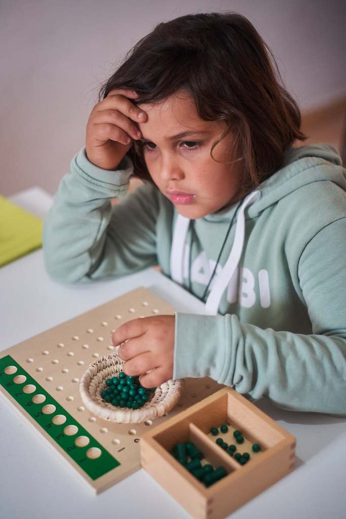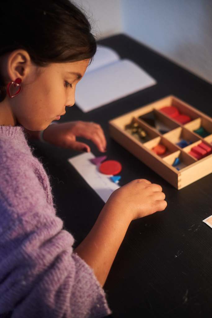 Les nouvelles notions sont introduites en petits groupes ou lors de grandes leçons et travaillées avec le support du matériel pédagogique conçu par Maria Montessori, lequel permet d’accompagner les enfants du sensoriel à l’abstraction.